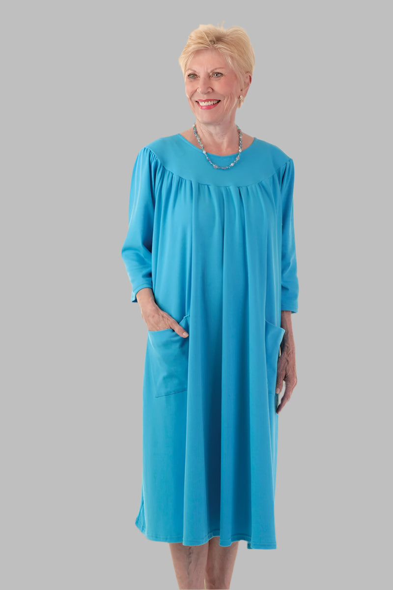 - Extra-wide yoke with gathers front and back for float fit