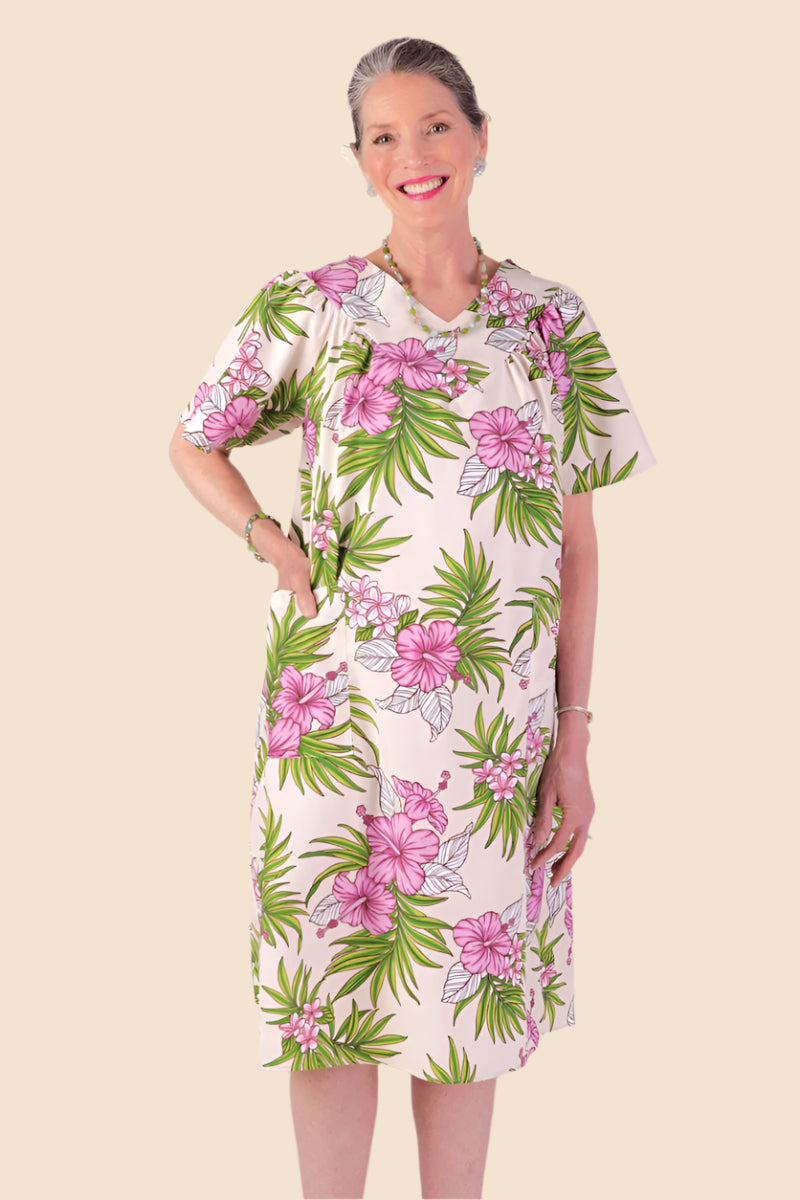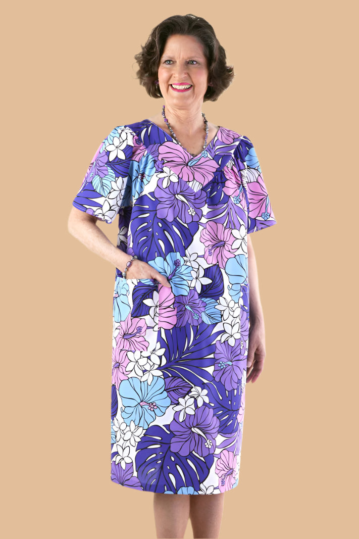An authentic Hawaiian muu muu featuring a V-neck, full cut flutter sleeves, and roomy patch pockets, showcasing traditional Hawaiian prints in an exclusive Buck & Buck® design.