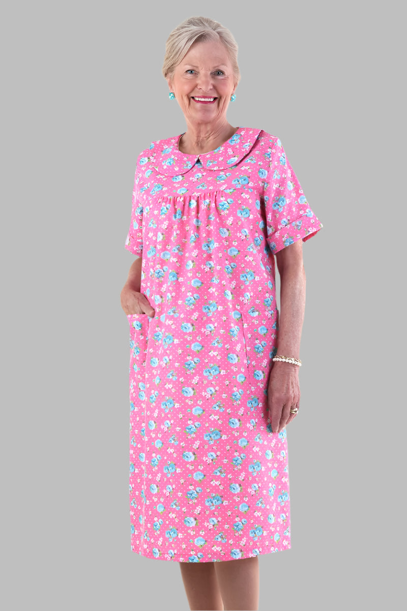 This snap-back muu muu offers a cut-away seat to reduce soiling and support limited range of motion. It slips on from the front and snaps down the back for excellent lap and leg coverage, simplifying changes for caregivers. Designed for non-ambulatory wearers, it features a gathered yoke, short raglan sleeves, and convenient patch pockets.