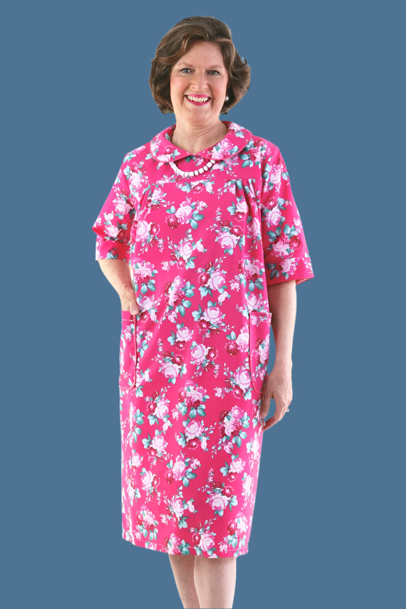 This snap-back duster features a Peter Pan collar with contrast piping, front gathers for a flattering drape, and a full back-snap closure for easy dressing.